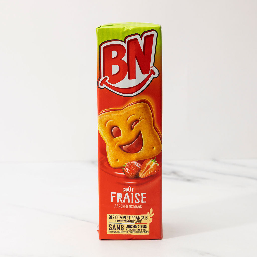 Biscuiterie Nantaise has been making cookies in France since the late 19th century. It consists of two golden cookies, often made with whole grains, filled with a strawberry-flavored cream. The cookies are a popular snack in France and other European countries and are identifiable by a face-like design on one of the cookies.