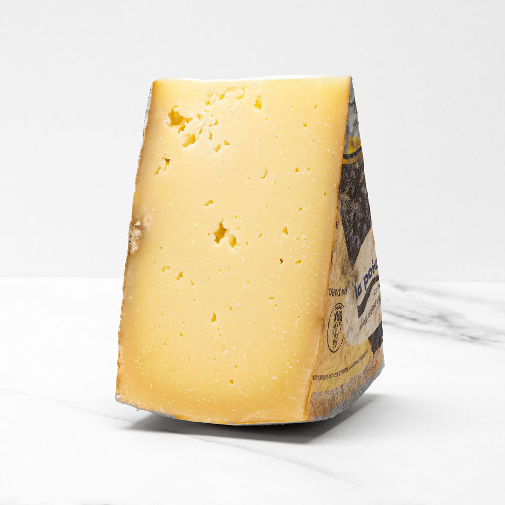 Bra duro is a hard, aged cow's milk cheese from Italy's Piedmont region, named for the town of Bra. Aged for at least 180 days, it has a hard, rugged rind and a strong, nutty, and slightly spicy flavor that develops with age. The cheese is excellent for grating over pasta, serving with fruit mostarda, or enjoying with red wine. Pair with fruit mostarda, hazelnuts, or on a cheese platter. Enjoy with full-bodied red wines like Barbera or Valpolicella.