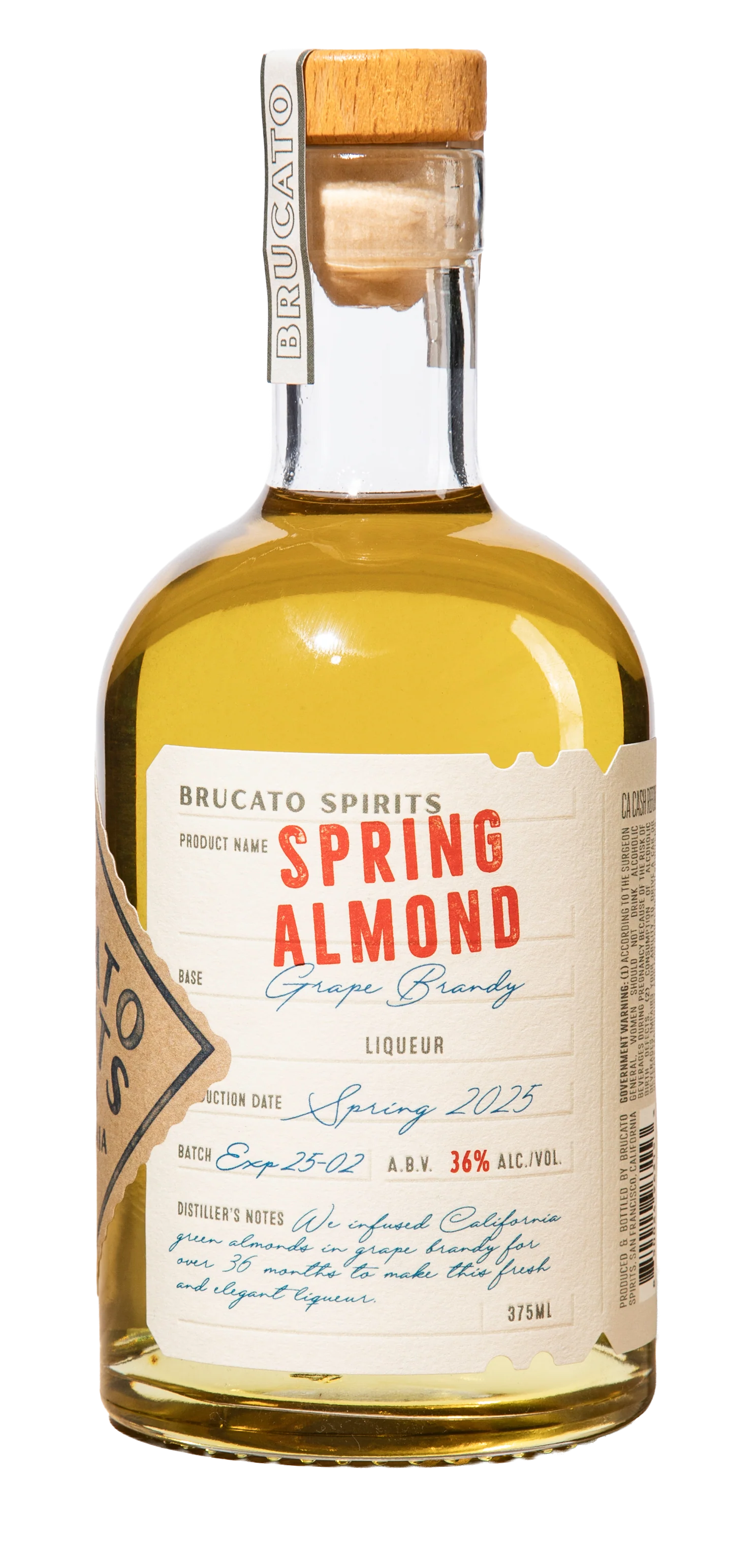 Brucato Spirits' "Spring Almond" is a limited-edition, Californian grape brandy-based liqueur made from macerated green almonds, offering bright, floral, marzipan, and citrus notes, serving as a fresh, light counterpoint to traditional dark amaros, and is a showcase for local ingredients in their experimental series.