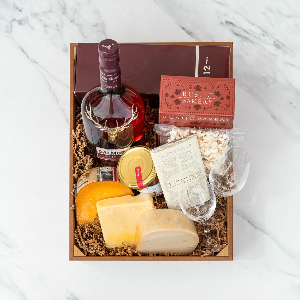 For the whisky connoisseur, we included the Dalmore 12, 15, or 18 year-old Highland Single Malt Whisky with branded copita glassware and paired it with the perfect accompaniments, extra-aged cheddar, our most popular Goudas, and the perfect array of sweets.