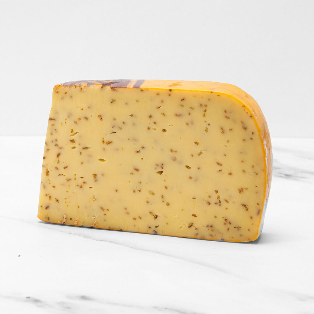 Leyden (or Leidse kaas) is a firm, semi-hard Dutch cheese known for its distinct tangy flavor and spicy aroma, derived from the addition of cumin seeds. Made from pasteurized cow's milk, it is similar to Gouda in shape but has a lower fat percentage and a sharper, spicier taste that intensifies with age. The cumin seeds provide a tangy, spicy flavor and aromatic scent, with the little seeds adding a crunchy texture. Leyden cheese is excellent on a cheese platter, with dark breads, or used in sandwiches and soups. It pairs well with spicy-sweet honey mustard, red wine, or dark, malty beers.