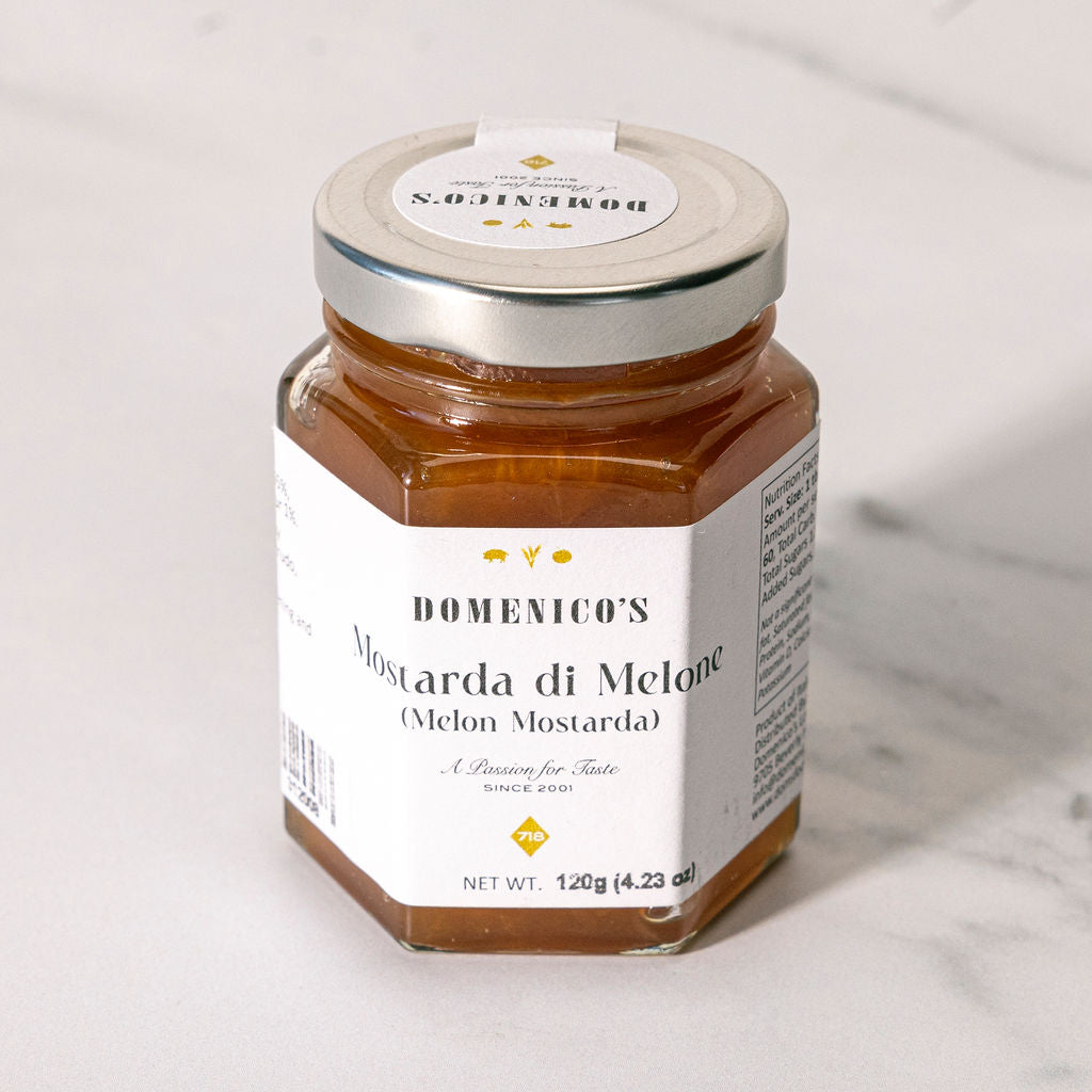 Mostarda di Melone is an Italian sweet-and-spicy condiment made from candied melon pieces preserved in a sugar syrup flavored with mustard essence. A specialty from the Mantuan and Lombardy regions of Italy, it is produced using traditional methods without artificial additives or preservatives. This flavorful condiment is traditionally served alongside boiled meats, aged cheeses like Parmigiano Reggiano, and fatty cured meats such as prosciutto.