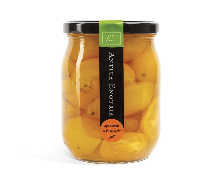 Antica Enotria Pomodori Datterini Gialli Naturale are organic, hand-picked yellow datterini tomatoes preserved in their own juice with only water and salt. The name "datterini" means "little dates" in Italian due to their sweet flavor. The tomatoes are grown and processed by Antica Enotria, a family-run, organic farm in the Puglia region of Italy and are preserved naturally with only water and salt, with no artificial preservatives. They can be used in a wide variety of dishes, including pasta sauces, on pizza, or as a garnish. Their sweet flavor pairs well with both fish and seafood.